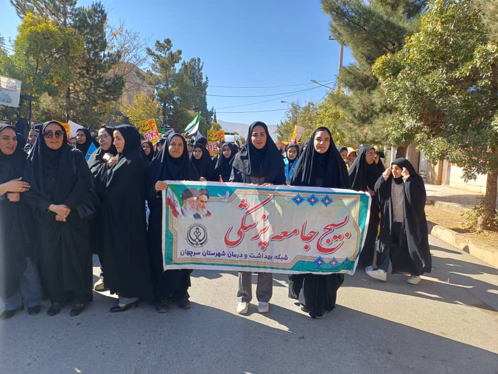به گزارش روابط عمومی شبکه بهداشت و درمان شهرستان سرچهان، مهندس عذرا جعفرپور، رییس شبکه بهداشت و درمان شهرستان به همراه پرسنل اورژانس ۱۱۵ و اعضای بسیج جامعه پزشکی در راهپیمایی پرشکوه یومالله ۱۳ آبان حضور یافتند. این حضور، بیانگر همبستگی و مشارکت جامعه سلامت در پاسداشت آرمانهای انقلاب اسلامی و گرامیداشت یاد و خاطره دانشآموزان و جوانان آزادهای است که در برابر استکبار جهانی ایستادگی کردند. در حاشیه این مراسم، شرکتکنندگان با سر دادن شعارهای «مرگ بر آمریکا» و «مرگ بر اسرائیل»، انزجار خود را از سیاستهای استکباری جهان اعلام کردند.