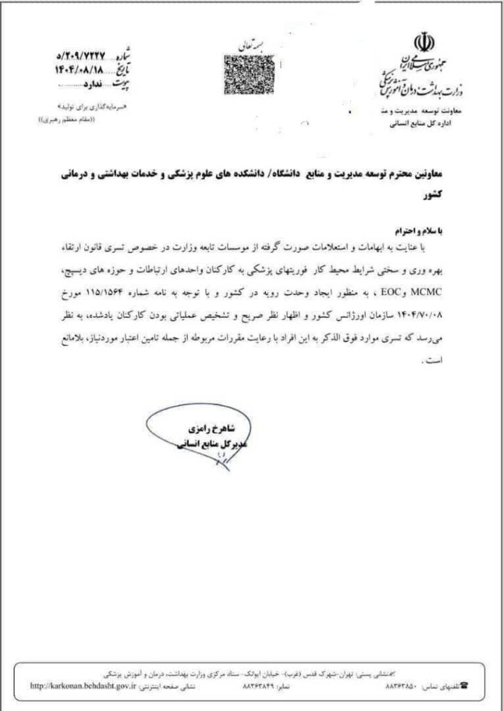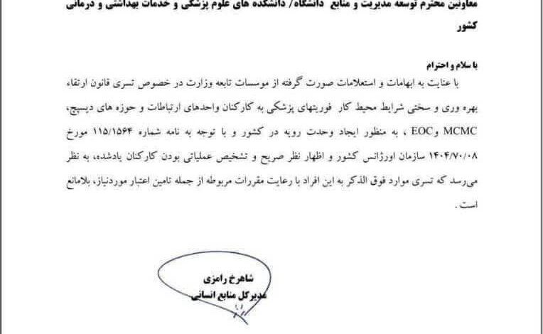 سرانجام تسری قانون ارتقاء بهره وری و سختی شرایط محیط کار فوریت های پزشکی به کارکنان واحد های ارتباطات ، دیسپچ ، MCMC ، EOC به دانشگاه های علوم پزشکی ابلاغ شد.